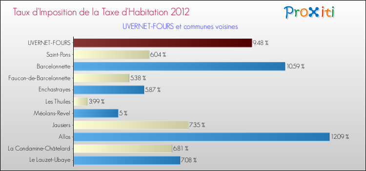 En 2012, le taux de la taxe d'habitation vôté par le conseil municipal de Uvernet-Fours était de : 9.48 %.