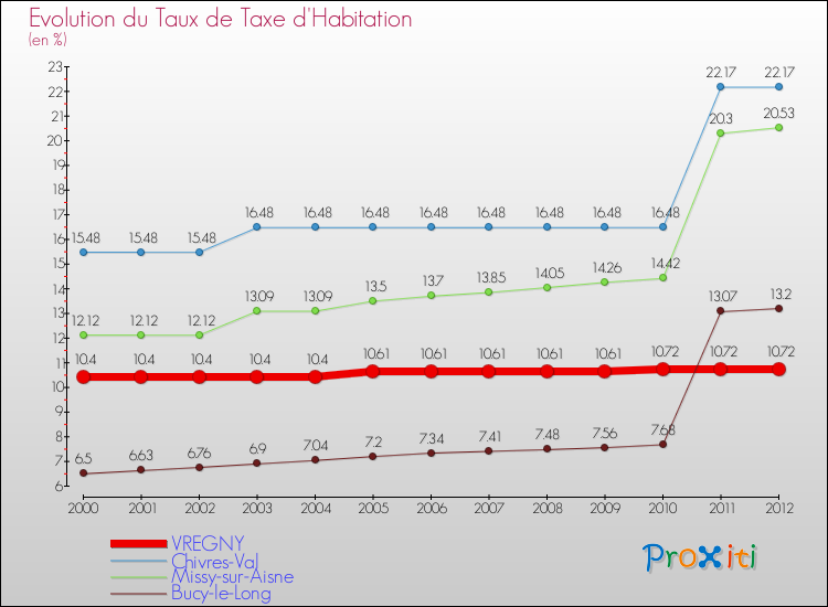 En 2012, le taux de la taxe d'habitation vôté par le conseil municipal de Vregny était de : 10.72 %.