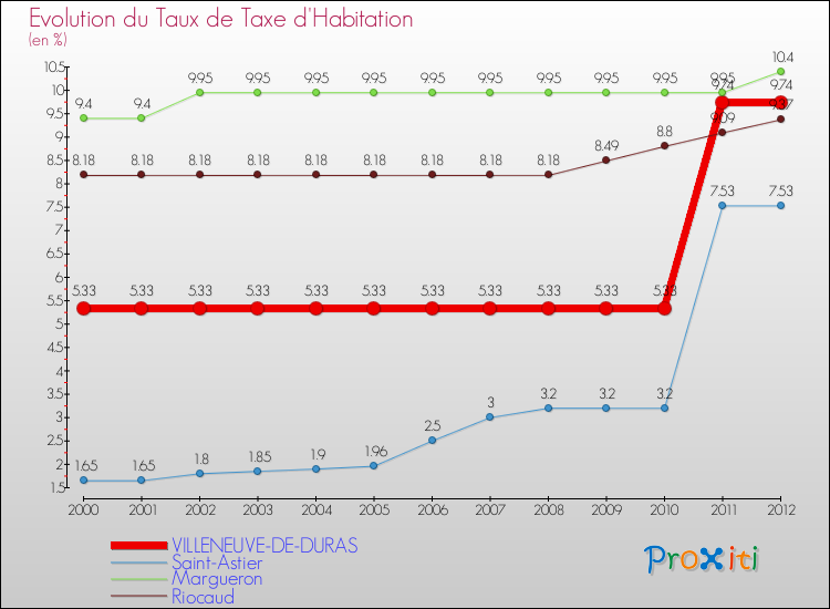 En 2012, le taux de la taxe d'habitation vôté par le conseil municipal de Villeneuve-de-Duras était de : 9.74 %.