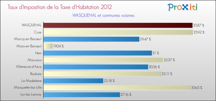 En 2012, le taux de la taxe d'habitation vôté par le conseil municipal de Wasquehal était de : 35.87 %.
