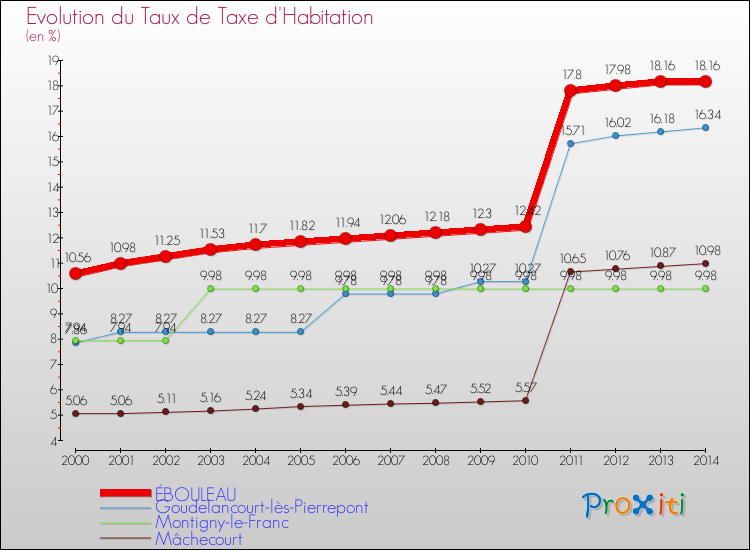 A Ébouleau, le taux de taxe d'habitation a ainsi augmenté de 71.97 % entre 2000 et 2014.