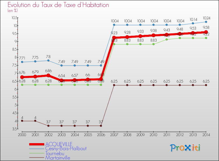 A Acqueville, le taux de taxe d'habitation a ainsi augmenté de 41.72 % entre 2000 et 2014.