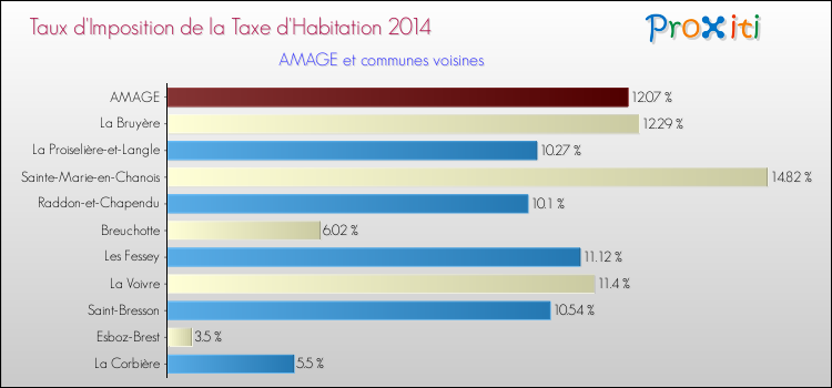 En 2014, le taux de la taxe d'habitation vôté par le conseil municipal de Amage était de : 12.07 %.