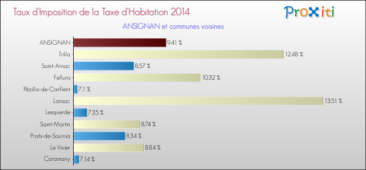 En 2014, le taux de la taxe d'habitation vôté par le conseil municipal de Ansignan était de : 9.41 %.