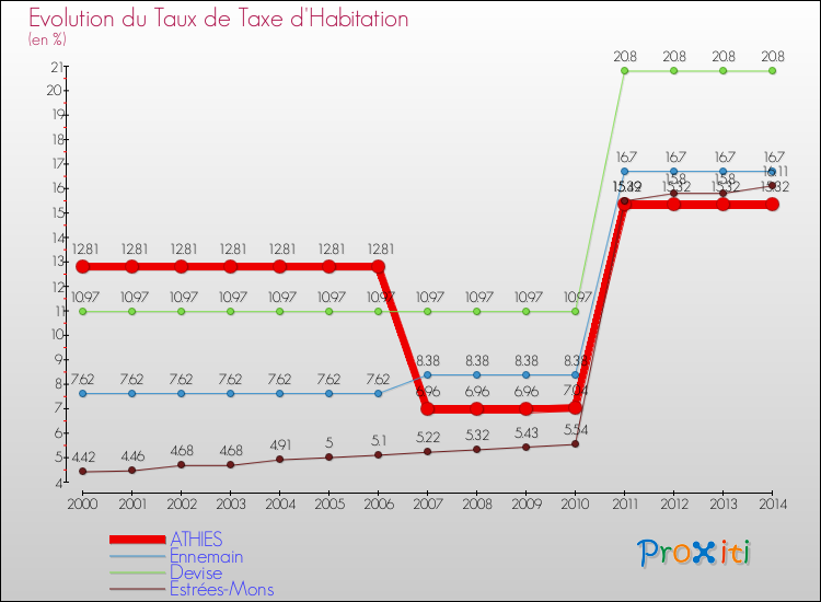 A Athies, le taux de taxe d'habitation a ainsi augmenté de 19.59 % entre 2000 et 2014.