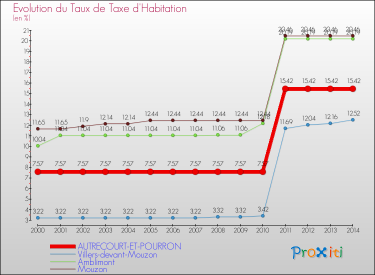 Pendant la même période, les communes françaises similaires à Autrecourt-et-Pourron, ont vu leur taux de taxe d'habitation augmenter de 38.29 % en moyenne entre 2000 et 2014.