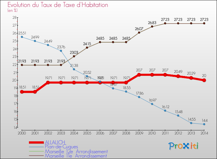 En 2014, le taux de la taxe d'habitation vôté par le conseil municipal de Allauch était de : 20 %.