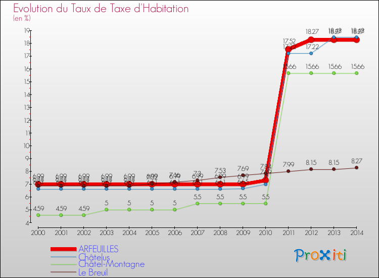 En 2014, le taux de la taxe d'habitation vôté par le conseil municipal de Arfeuilles était de : 18.27 %.
