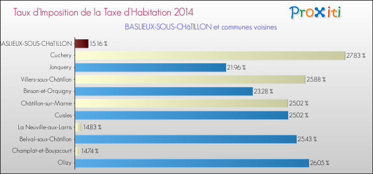 En 2014, le taux de la taxe d'habitation vôté par le conseil municipal de Baslieux-sous-Châtillon était de : 15.16 %.