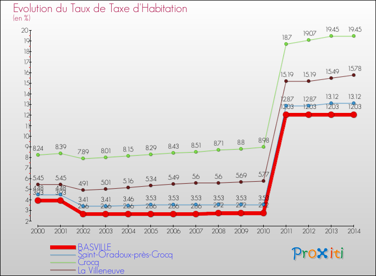 En 2014, le taux de la taxe d'habitation vôté par le conseil municipal de Basville était de : 12.03 %.