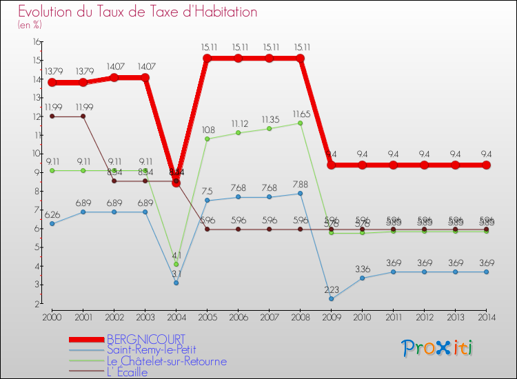 En 2014, le taux de la taxe d'habitation vôté par le conseil municipal de Bergnicourt était de : 9.4 %.