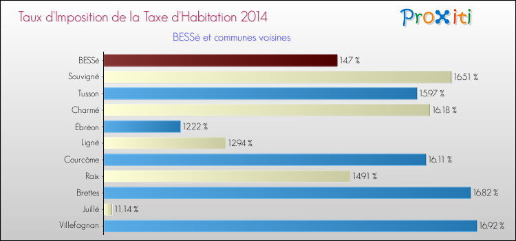 En 2014, le taux de la taxe d'habitation vôté par le conseil municipal de Bessé était de : 14.7 %.
