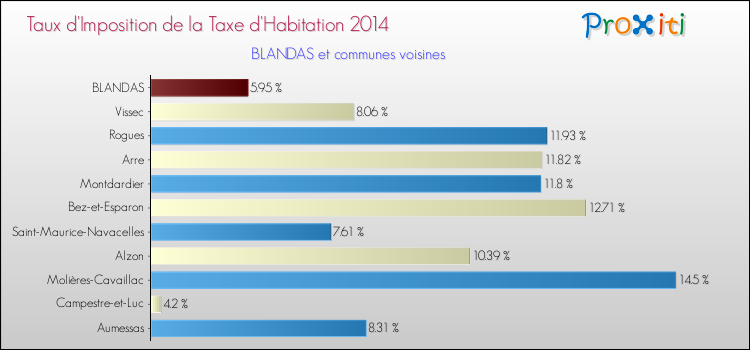 Vous trouverez ci-dessous des graphiques qui vous permettent de situer le taux de la taxe d'habitation de Blandas par rapport aux communes voisines.