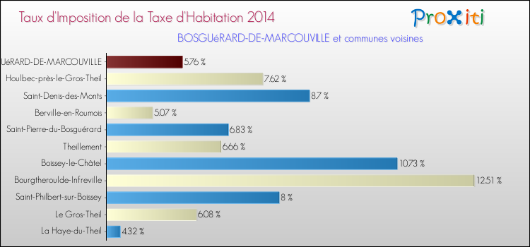 Vous trouverez ci-dessous des graphiques qui vous permettent de situer le taux de la taxe d'habitation de Bosguérard-de-Marcouville par rapport aux communes voisines.