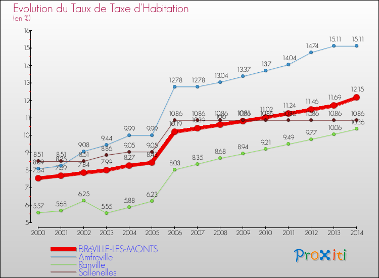 A Bréville-les-Monts, le taux de taxe d'habitation a ainsi augmenté de 61.14 % entre 2000 et 2014.