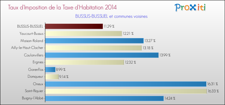 En 2014, le taux de la taxe d'habitation vôté par le conseil municipal de Bussus-Bussuel était de : 11.29 %.