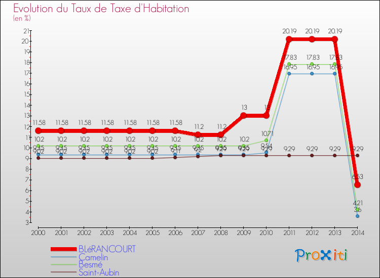 En 2014, le taux de la taxe d'habitation vôté par le conseil municipal de Blérancourt était de : 6.53 %.