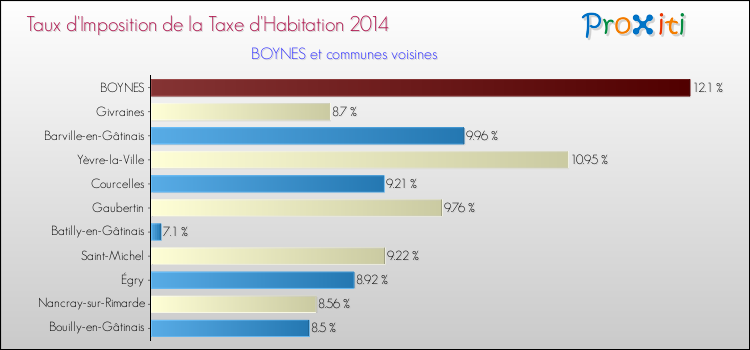 En 2014, le taux de la taxe d'habitation vôté par le conseil municipal de Boynes était de : 12.1 %.