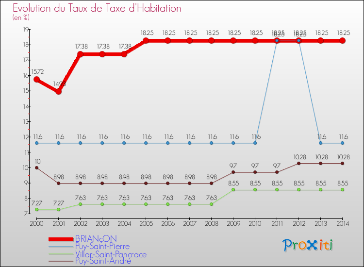 A Briançon, le taux de taxe d'habitation a ainsi augmenté de 16.09 % entre 2000 et 2014.