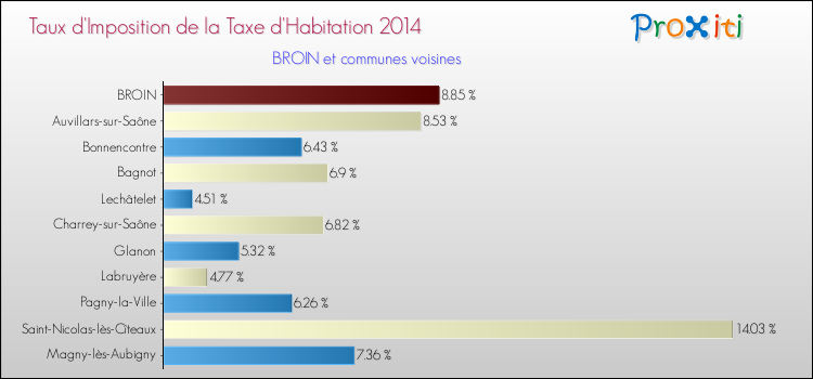 Vous trouverez ci-dessous des graphiques qui vous permettent de situer le taux de la taxe d'habitation de Broin par rapport aux communes voisines.