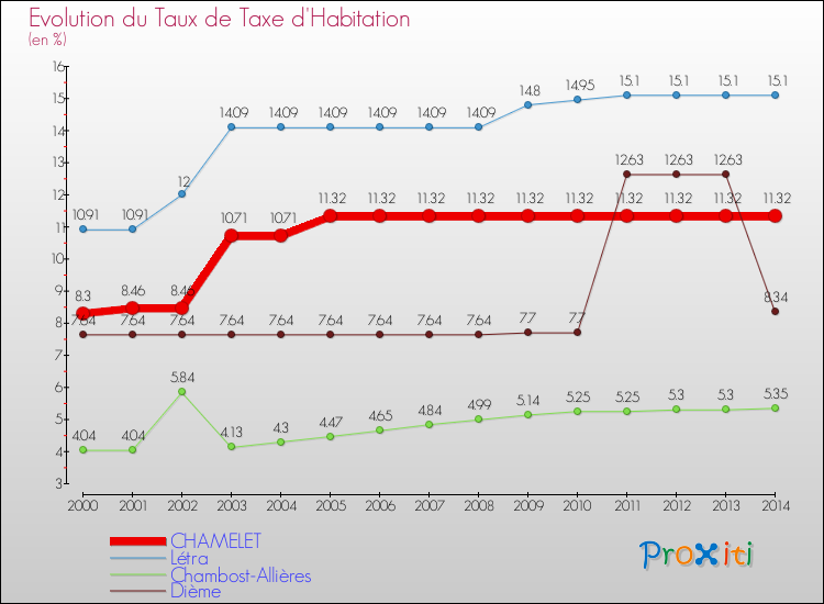 A Chamelet, le taux de taxe d'habitation a ainsi augmenté de 36.39 % entre 2000 et 2014.