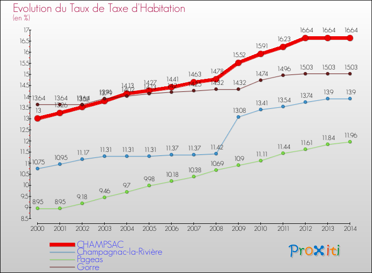 Pendant la même période, les communes françaises similaires à Champsac, ont vu leur taux de taxe d'habitation augmenter de 29.1 % en moyenne entre 2000 et 2014.