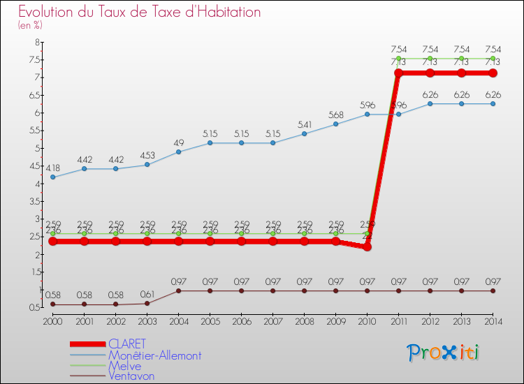 Pendant la même période, les communes françaises similaires à Claret, ont vu leur taux de taxe d'habitation augmenter de 79.08 % en moyenne entre 2000 et 2014.