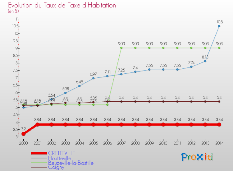 En 2014, le taux de la taxe d'habitation vôté par le conseil municipal de Cretteville était de : 3.84 %.