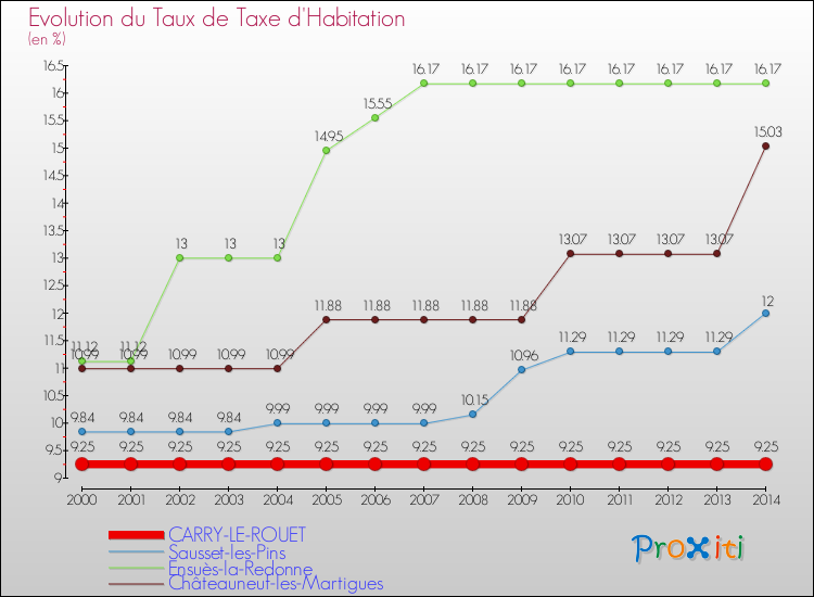 Pendant la même période, les communes françaises similaires à Carry-le-Rouet, ont vu leur taux de taxe d'habitation augmenter de 22.71 % en moyenne entre 2000 et 2014.