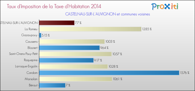 En 2014, le taux de la taxe d'habitation vôté par le conseil municipal de Castelnau-sur-l'Auvignon était de : 7.7 %.