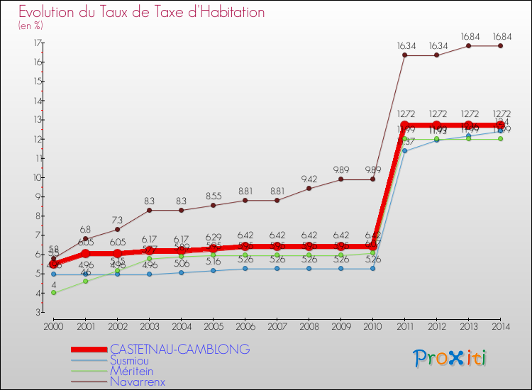 Le graphique ci dessous représente l'évolution du taux de la taxe d'habitation à Castetnau-Camblong depuis 2000.