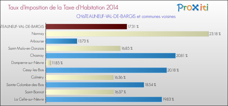 Vous trouverez ci-dessous des graphiques qui vous permettent de situer le taux de la taxe d'habitation de Châteauneuf-Val-de-Bargis par rapport aux communes voisines.