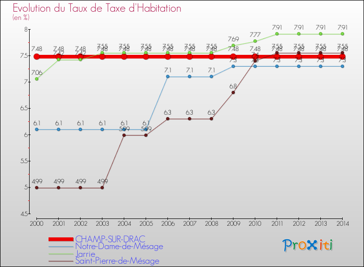 En 2014, le taux de la taxe d'habitation vôté par le conseil municipal de Champ-sur-Drac était de : 7.48 %.