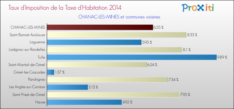 En 2014, le taux de la taxe d'habitation vôté par le conseil municipal de Chanac-les-Mines était de : 6.55 %.