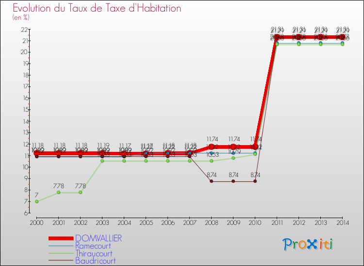 Pendant la même période, les communes françaises similaires à Domvallier, ont vu leur taux de taxe d'habitation augmenter de 107.41 % en moyenne entre 2000 et 2014.