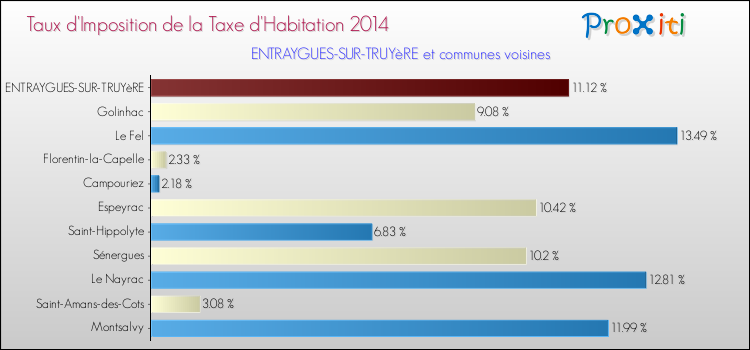 En 2014, le taux de la taxe d'habitation vôté par le conseil municipal de Entraygues-sur-Truyère était de : 11.12 %.