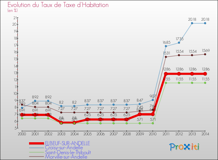 En 2014, le taux de la taxe d'habitation vôté par le conseil municipal de Elbeuf-sur-Andelle était de : 12.86 %.