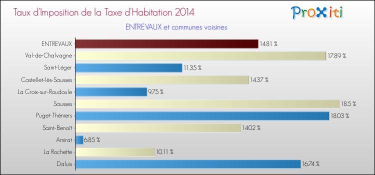 En 2014, le taux de la taxe d'habitation vôté par le conseil municipal de Entrevaux était de : 14.81 %.