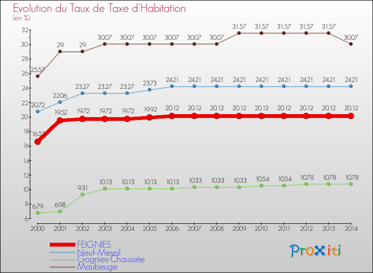 Pendant la même période, les communes françaises similaires à Feignies, ont vu leur taux de taxe d'habitation augmenter de 22.71 % en moyenne entre 2000 et 2014.