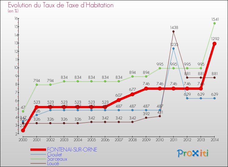 Pendant la même période, les communes françaises similaires à Fontenai-sur-Orne, ont vu leur taux de taxe d'habitation augmenter de 40.93 % en moyenne entre 2000 et 2014.