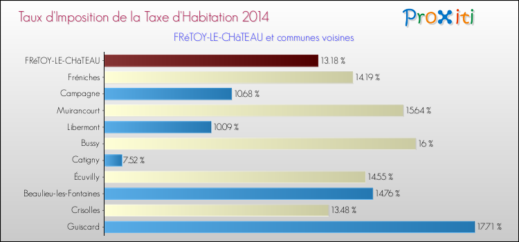 Vous trouverez ci-dessous des graphiques qui vous permettent de situer le taux de la taxe d'habitation de Frétoy-le-Château par rapport aux communes voisines.