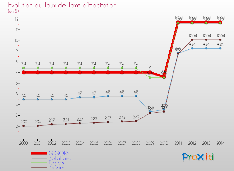 En 2014, le taux de la taxe d'habitation vôté par le conseil municipal de Gigors était de : 11.68 %.