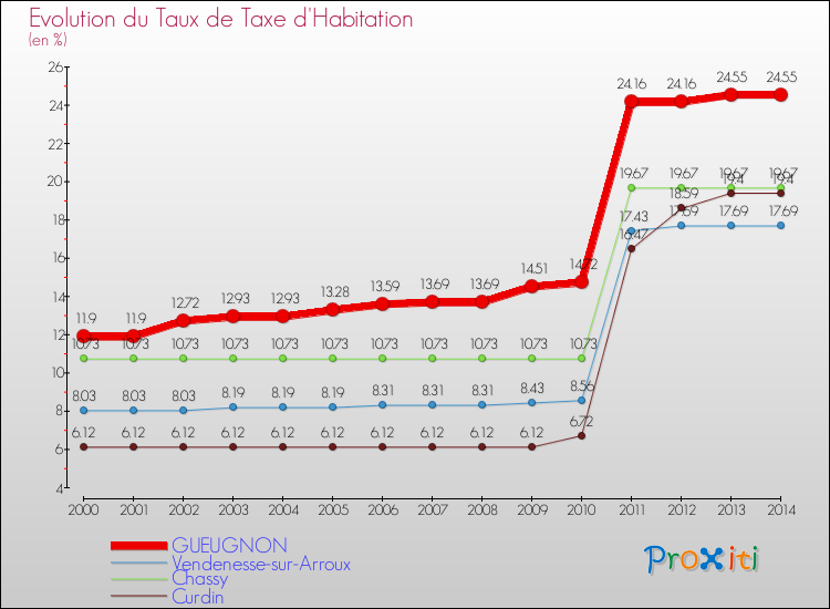 En 2014, le taux de la taxe d'habitation vôté par le conseil municipal de Gueugnon était de : 24.55 %.