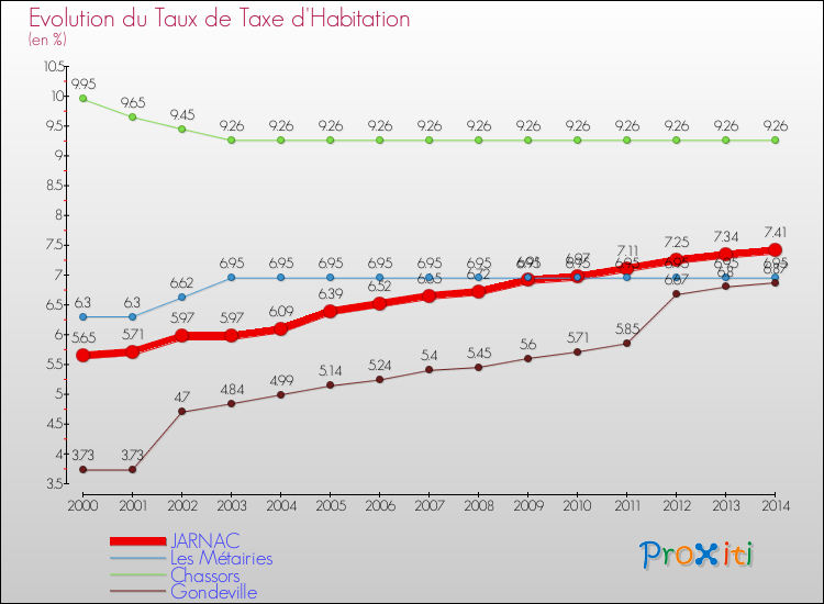 En 2014, le taux de la taxe d'habitation vôté par le conseil municipal de Jarnac était de : 7.41 %.