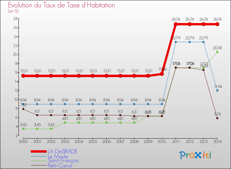 En 2014, le taux de la taxe d'habitation vôté par le conseil municipal de La Désirade était de : 26.74 %.