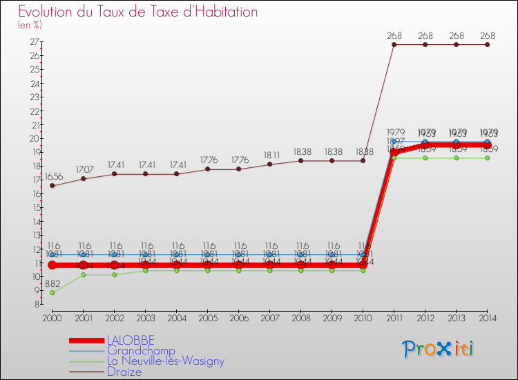 A Lalobbe, le taux de taxe d'habitation a ainsi augmenté de 80.67 % entre 2000 et 2014.