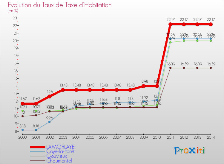 Pendant la même période, les communes françaises similaires à Lamorlaye, ont vu leur taux de taxe d'habitation augmenter de 63.05 % en moyenne entre 2000 et 2014.