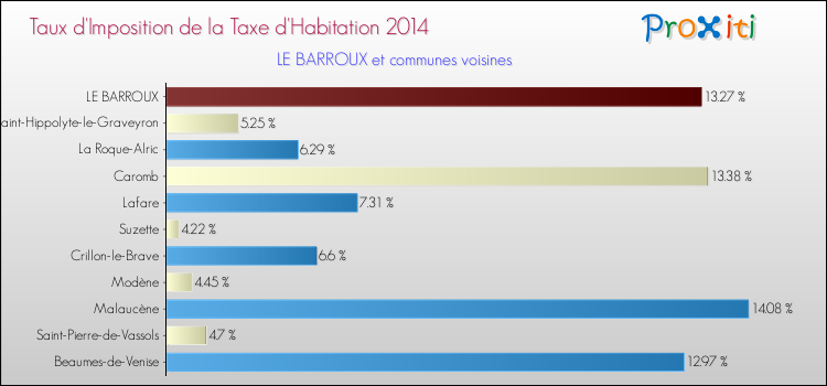 En 2014, le taux de la taxe d'habitation vôté par le conseil municipal de Le Barroux était de : 13.27 %.