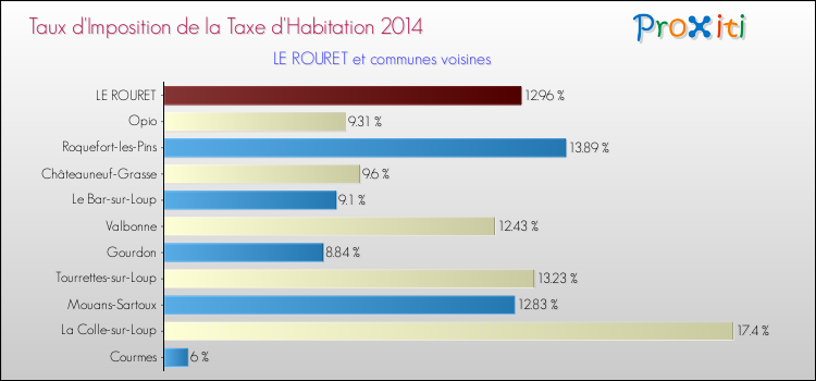 En 2014, le taux de la taxe d'habitation vôté par le conseil municipal de Le Rouret était de : 12.96 %.