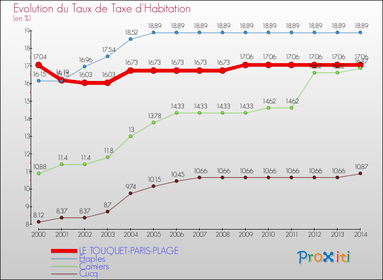 A Le Touquet-Paris-Plage, le taux de taxe d'habitation a ainsi augmenté de 0.12 % entre 2000 et 2014.